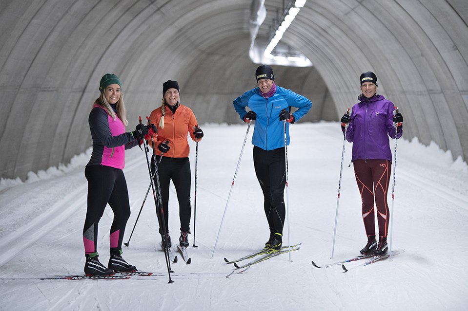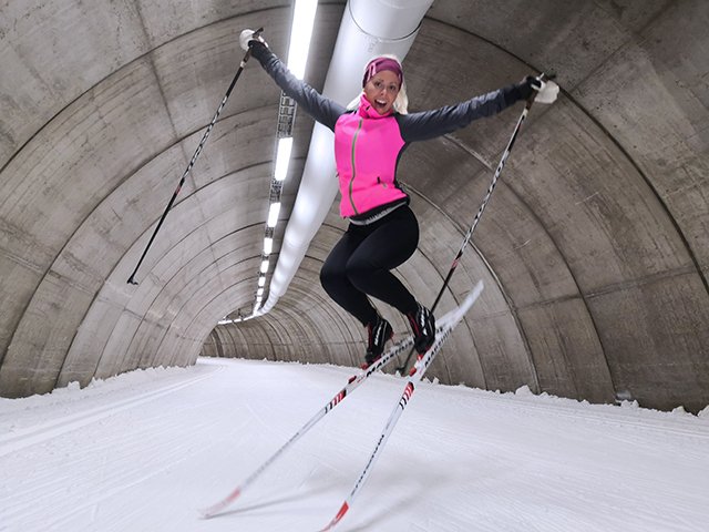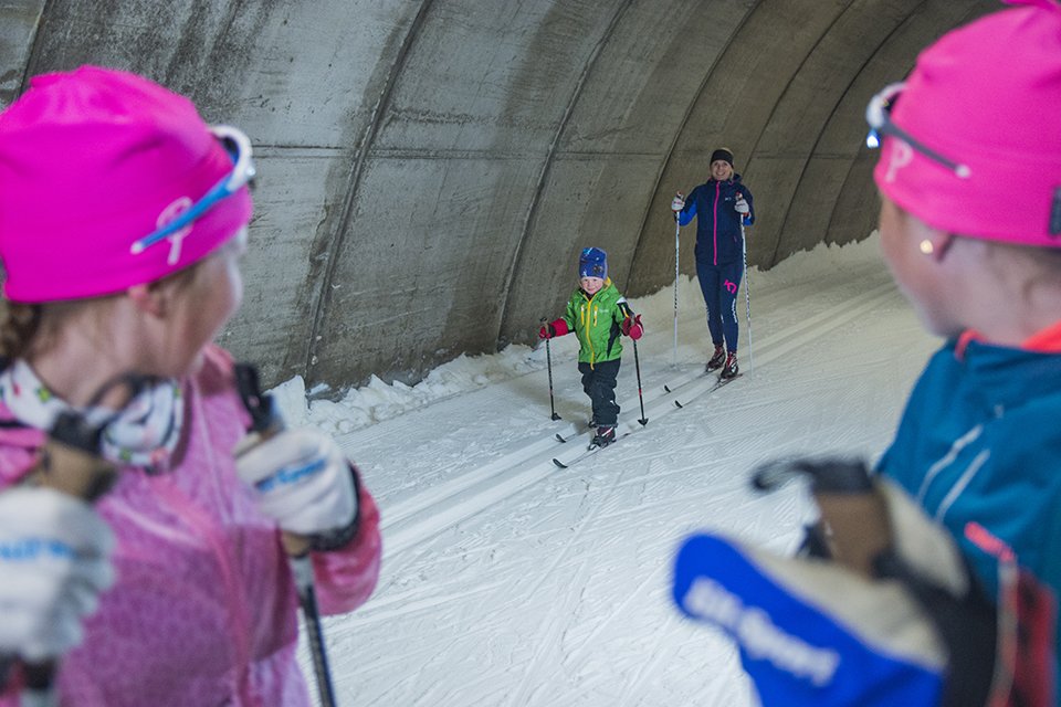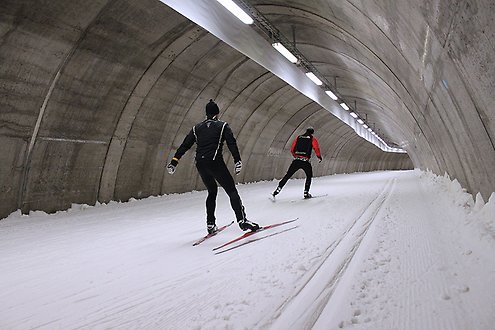 Но тунелът предоставя различно изживяване. Ентусиастите влизат в светла закрита зала с размерите на баскетболно игрище, чийто под е покрит със сняг. Тунелът има две успоредни писти с дължина 1,3 км и може да се кара в двете посоки, което прави общо разстояние от 2,6 км. Веригата започва и завършва в залата. Тук температурата винаги е -4 градуса. Няма вятър и лед. Условията за каране на ски от техническа гледна точка са перфектни.