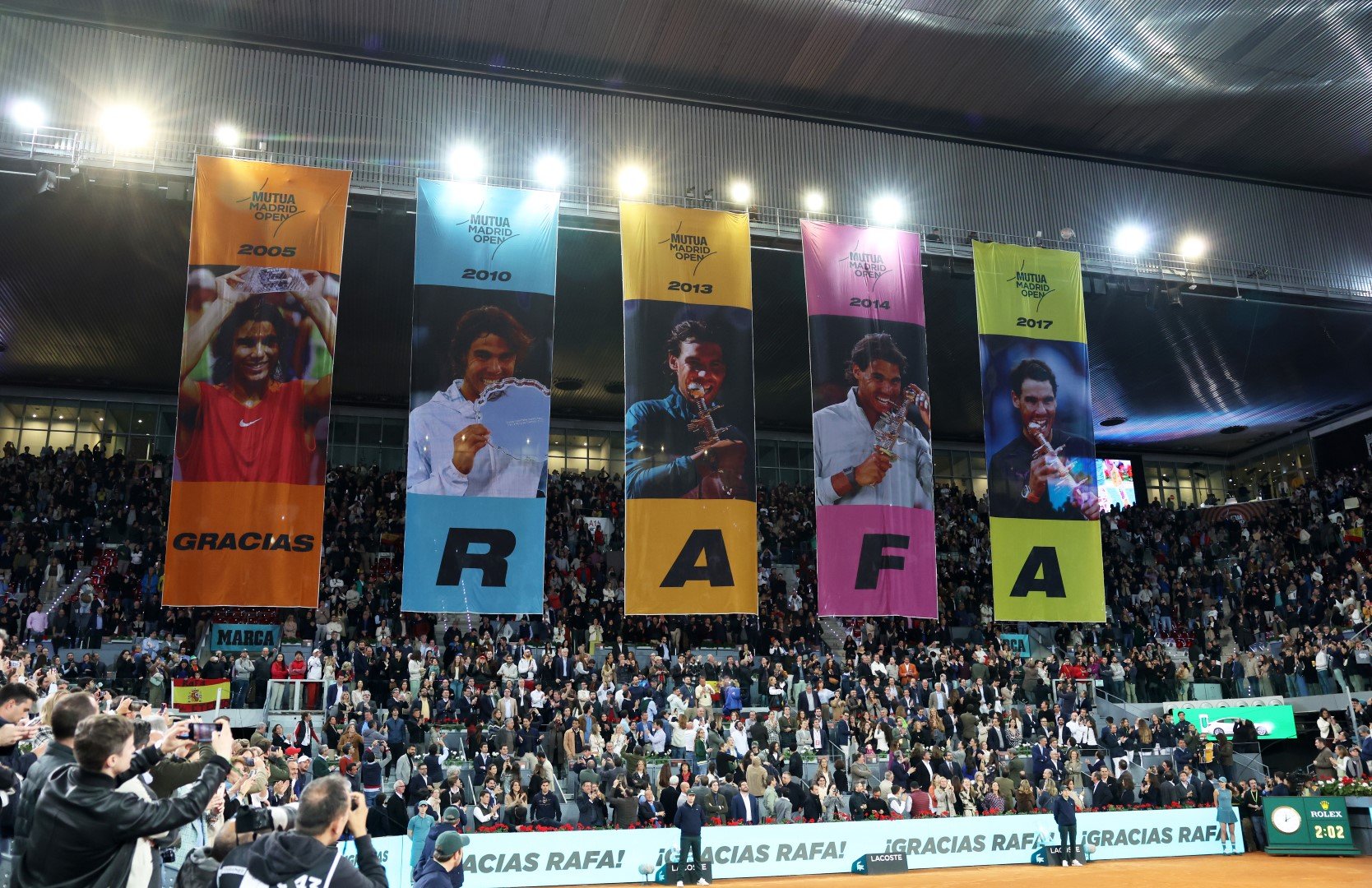 "Благодаря ви, невероятно е и на тези снимки изглеждам друг човек, толкова отдавна са правени - пошегува се Рафа с микрофона от корта, докато над трибуните се спускаше хореография с пет огромни банера. На тях имаше фотоси от петте му триумфа на турнира. - Всяко нещо си има край.