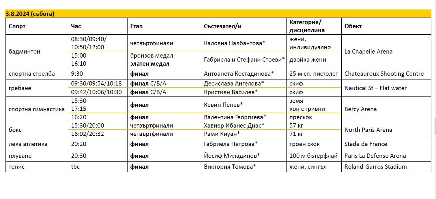 Последният уикенд (10-11 август) ще ни покаже схватки в борбата (в категориите на Биляна Дудова и Юлиана Янева, ако стигнат до тях), при ансамблите в художествена гимнастика, както и в скока на височина при мъжете, където чакаме добро представяне от Тихомир Иванов.