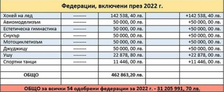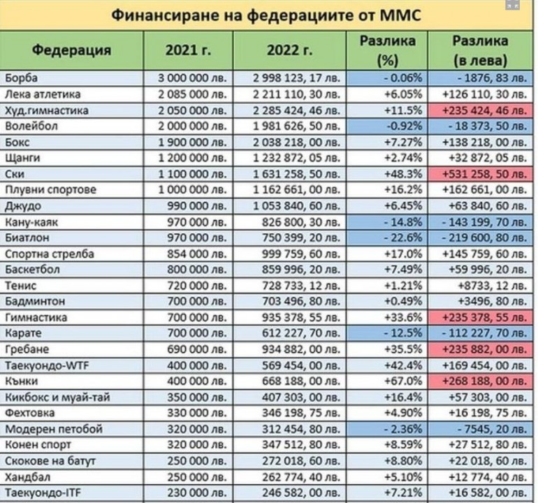 По официални данни, през 2021 г. (министър Красен Кралев - ГЕРБ) 46-те федерации са получили 27 459 000 лв., докато за 2022 г. (министър Радостин Василев - ИТН) 54 взимат 31 205 991,70 лв. Общата сума е с 3 746 991.70 лв. повече (13.64%), т. е. - процентно увеличението е много по-малко, отколкото е общото нарастване на бюджета на ММС по това перо.