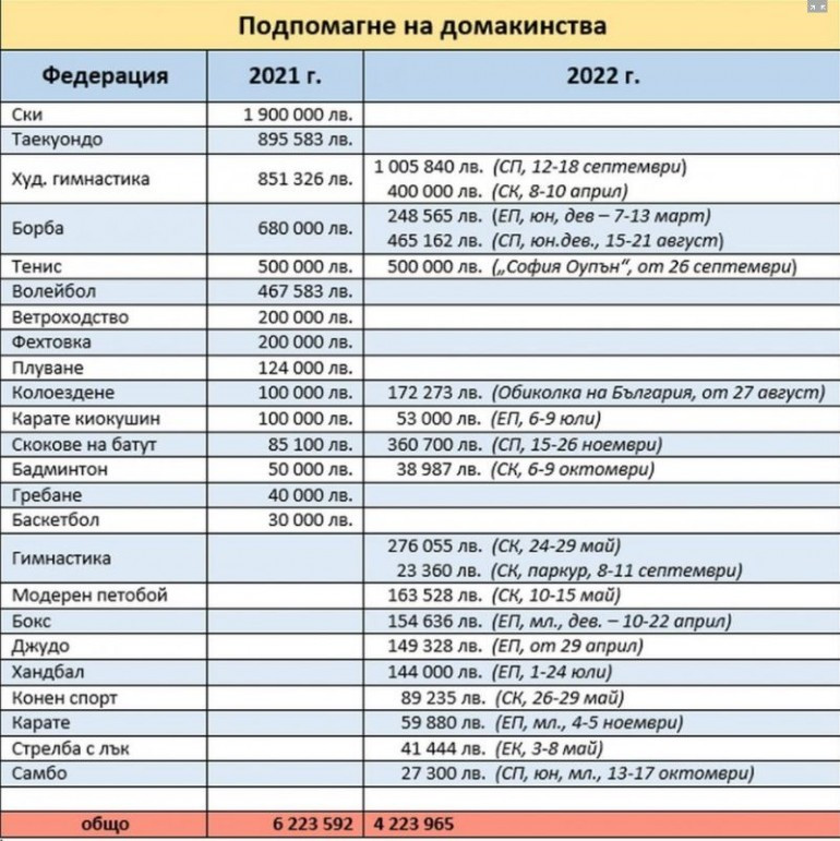 Относно домакинствата на федерациите също има драстично намаляване. Там Василев и ММС са подходили твърде консервативно и при отпускането на средства за подпомагане на домакинства на международни състезания в България през 2022 г. Независимо от увеличения си драстично бюджет.