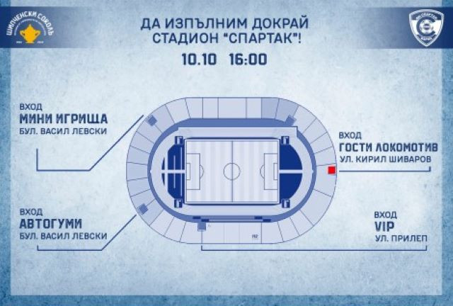 За удобство на гостите от "Локомотив" е осигурена каса на входа откъм ул. “Кирил Шиваров”. Останалите каси са – две откъм бул. “Васил Левски” (вход мини игрища и вход автогуми) и една – откъм ул. “Прилеп” (VIP-трибуна). Всички каси ще отворят в 14:30ч.