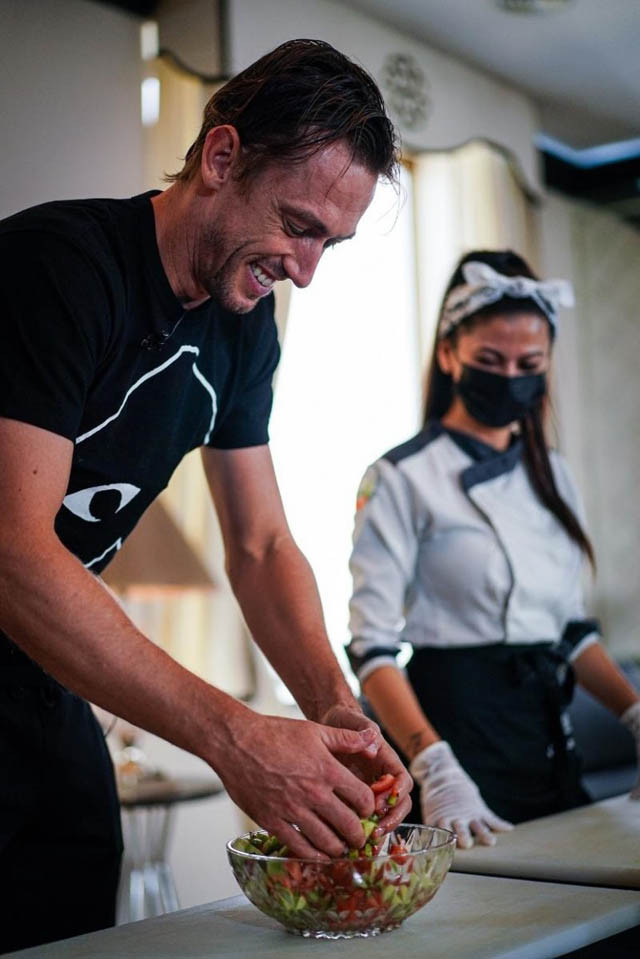 С помощта на су шеф Филиз Сали от хотел Marinela Sofia Джон се запозна с технологията на приготвянето, след което смеси съставките на салата и гарнира с настъргано сирене.