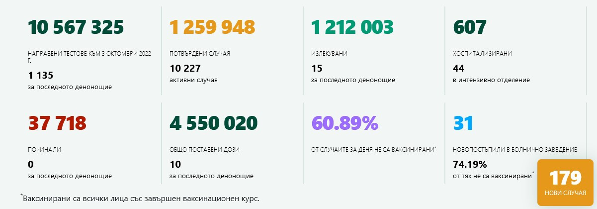 179 са новозаразените с Covid 19, сочат данните в единната информационна система. Те са със 119 по-малко от вчера.