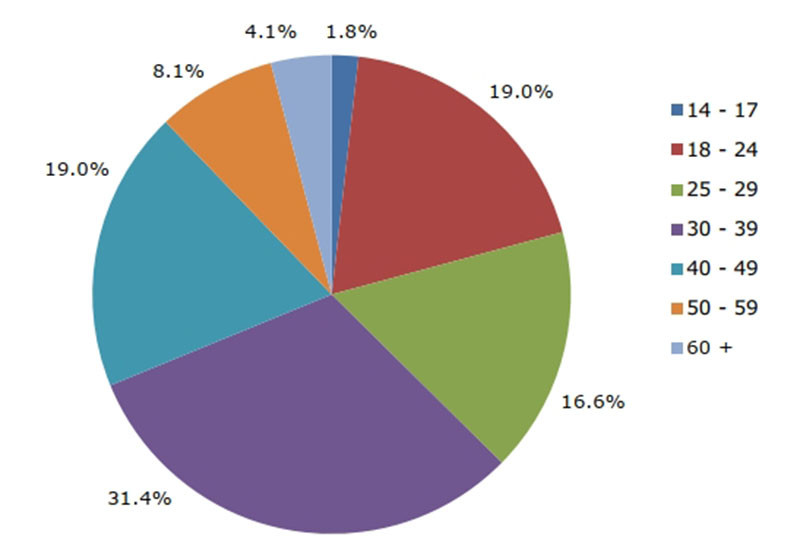 Както сред мъжете, така и сред жените, най-голям е делът на осъдените във възрастовата група от 30 до 39 години - съответно 31.3% за мъжете и 31.8% за жените. На второ място при мъжете е групата от 18 до 24 г. - 19.4%, а при жените групата от 25 до 29 г. - 20.4%.