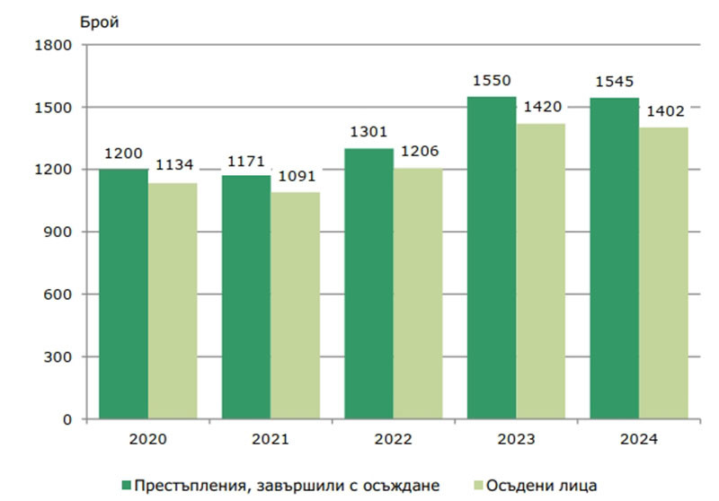 През 2024 г. най-голям е броят на общоопасните престъпления - 834, или 54.0% от общия брой на престъпленията, завършили с осъдителни присъди.
