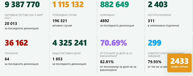 На 14 март са поставени 1 853 ваксини, от началото на кампанията за имунизиране техният брой е 4 325 241. Със завършена ваксинация са 2 053 901 души, бустерна доза са си поставили 703 983 души.