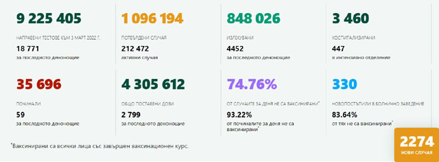 От началото на пандемията до момента карантинираните души в България са общо 2 503 044, от тях 33 017 са активни към момента. През последното денонощие в болница са приети 3 460.