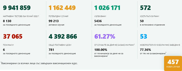 За последното денонощие починалите са 6. Общо починали от началото на пандемията са 37 065. Новопостъпили в болница са 53 души, като 77.36% от тях не са ваксинирани. Хоспитализирани с COVID-19 са 572 души, от които 50 са в интензивни отделения.