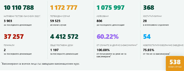 За последното денонощие са направени общо 3903 теста. Починалите са двама, а броят на поставените дози е 1197. Общо новохоспитализирани са 54, от които 41 неваксинирани и 13 ваксинирани. Постъпили в интензивно отделение няма.