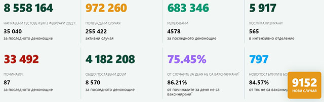 9152 са новодиагностицираните с коронавирусна лица у нас през изминалите 24 часа. Малко над 26% от направените през денонощието тестове са дали положителен резлтат за коронавирусната инфекция.