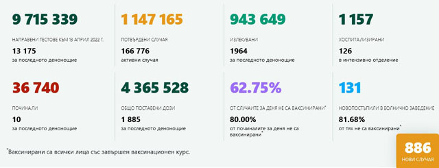 886, с 15 случая повече от вчера, са новодиагностицираните с коронавирусна инфекция през изминалите 24 часа. Това са 6,72% от тестваните. За последното денонощие са направени общо 13 175 теста Това показват данните в Националната информационна система.