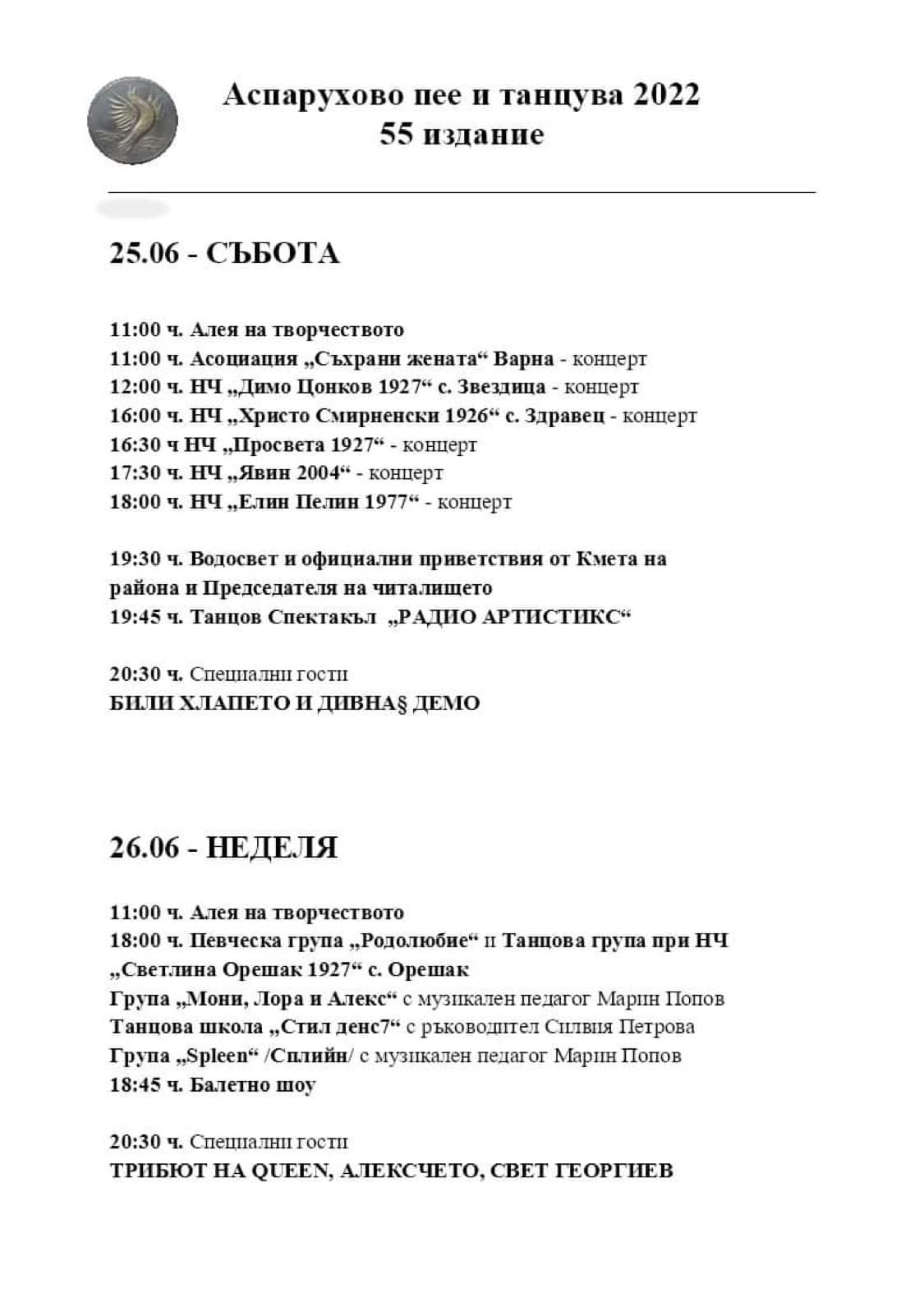 През почивните дни програмата на фестивала "Аспарухово пее и танцува" ще продължи с Алея на творчеството, концерти на гости от варненски читалища, а в събота гостуващи звезди ще бъдат Били Хлапето и Дивна.