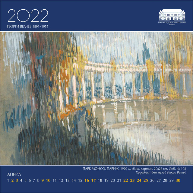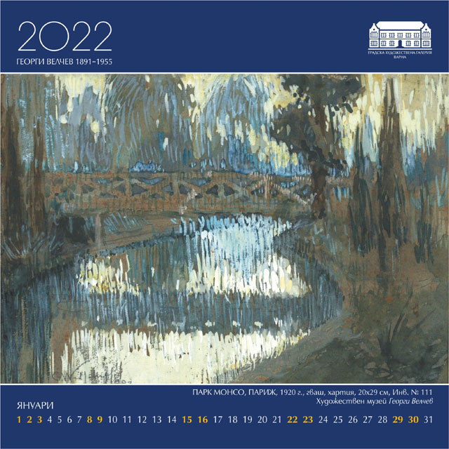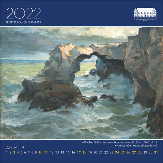 В навечерието на новата 2022 година Градската художествена галерия „Борис Георгиев“ – Варна, обръща поглед към високите стойности на българското пластично изкуство. В календара за новата година екипът на галерията припомня приноса на класика на морския пейзаж Георги Велчев. Поводът е 130-годишнината от рождението на големия български художник, отбелязана през изтичащата година. В изданието са включени пейзажи на обичаните от Велчев места по Българското Черноморие - нос Света Галина, Созопол, Калиакра, остров Свети Иван, прочутата Арка край Тюленово, както и паркови пейзажи от парижкия период на художника.