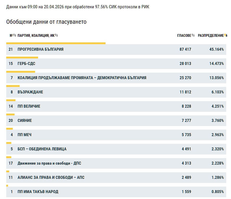 Във Варна при 97,56% обработени протоколи, данните на Централната избирателна комисия сочат 45,16% подкрепа за коалиция "Прогресивна България". "ГЕРБ-СДС" са подкрепили 14,47%, а "Продължаваме промяната - Демократична България" - 13,0 на сто.
