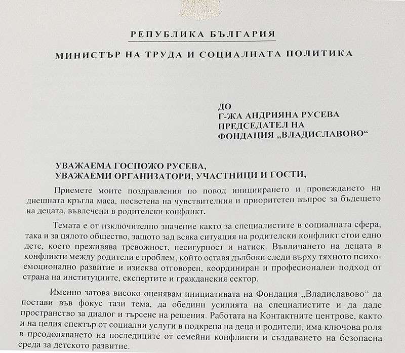 „Високо оценявам инициативата на Фондация „Владиславово“, с която се поставя фокус върху темата за чувствителния и приоритетен въпрос за бъдещето на децата, въвлечени в родителски конфликт. Усилията да се организира форум, който да е място за диалог между специалисти и търсене на решения, е в унисон с политиката на МТСП да формира комплексна, добре координирана и модерна система за закрила на детето“. Това заяви Зорница Василева, началник на кабинета на министъра на труда и социалната политика Борислав Гуцанов. Тя беше сред основните участници в работата на кръгла маса „Децата, въвлечени в родителски конфликт“, организирана от Фондация „Владиславово“, която се проведе на 5 декември 2025 г. във Варна.