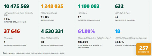 У нас през изминалото денонощие са регистрирани 257 положителните случаи с COVID-19. Направени са 1 807 теста, показват актуализираните данни на Единния информационен портал.