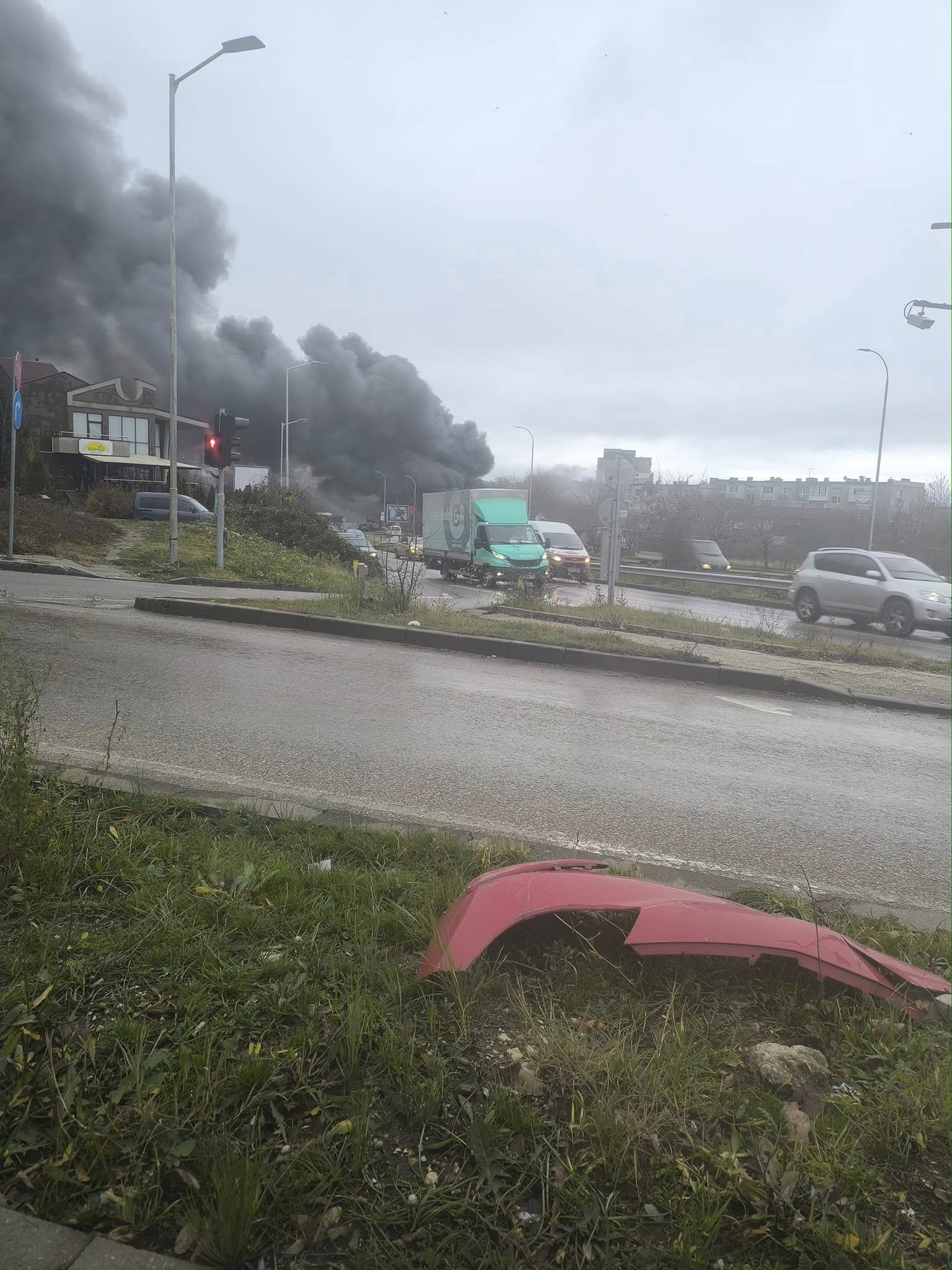 Видеа в социалните мрежи показват огромни кълба гъст черен дим, които се стелят. Видимостта в района е намалена, разказват очевидци.