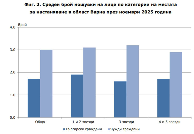През ноември 2025 година във Варна работят общо 137 места за настаняване с над 10 легла – хотели, мотели, къмпинги, хижи и други обекти. Общият брой на стаите достига 5.4 хиляди, а леглата вече са 12.5 хиляди, което бележи увеличение съответно с 0.7% за местата за настаняване и 4.2% за леглата спрямо ноември 2024 година, сочат данните от статистиката.