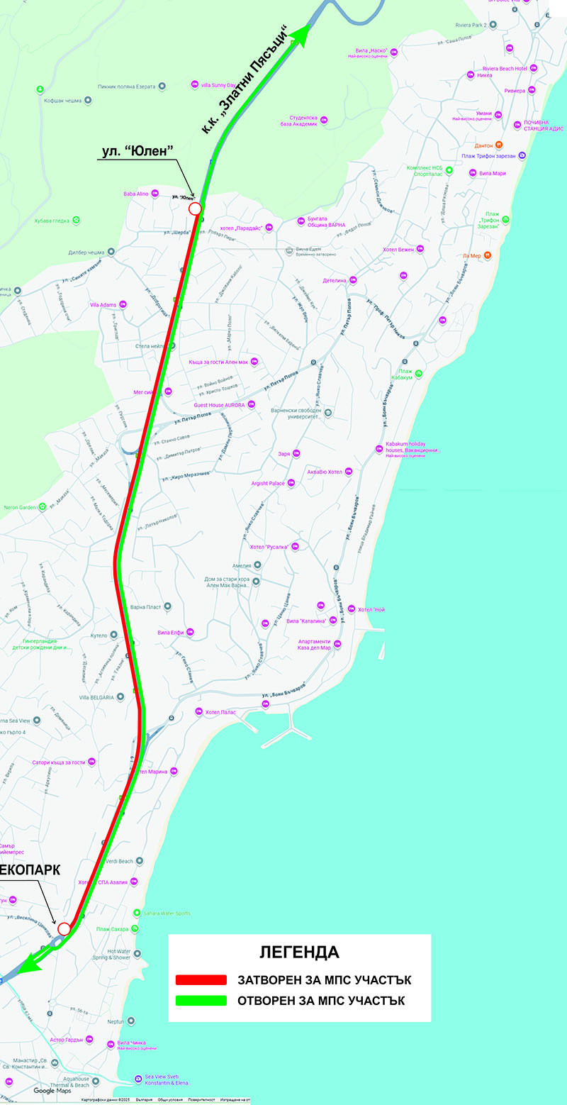 Участъкът от 3,5 км ще бъде изцяло затворен, а не на етапи, уточниха изпълнителите. Движението ще се извършва двупосочно в южното платно (посока КК Златни пясъци).