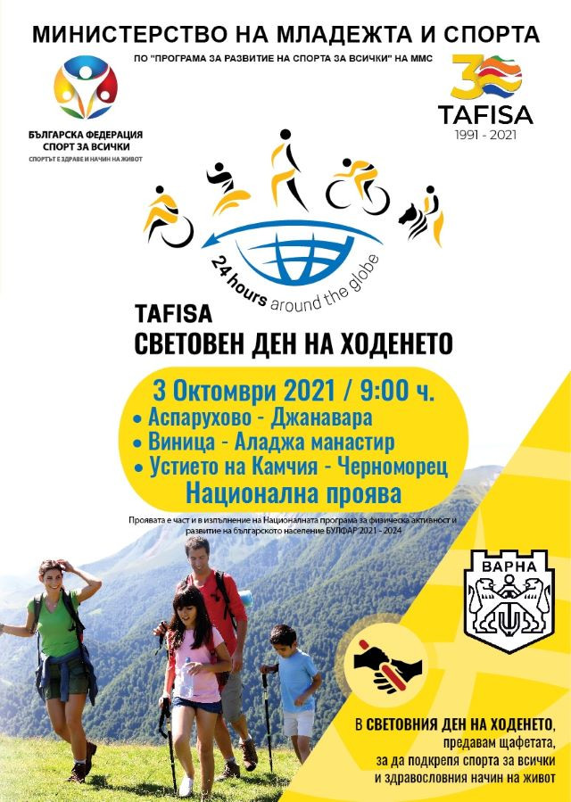 Българска федерация спорт за всички /БФСВ/ организира за 29-ти пореден път Национална спортна проява Световен ден на ходенето с финансовата подкрепа на Министерството на младежта и спорта. Проявата се осъществява под патронажа на министър Андрей Кузманов. В световен мащаб проявата е част от програмата на Международната асоциация спорт за всички ТАФИСА.