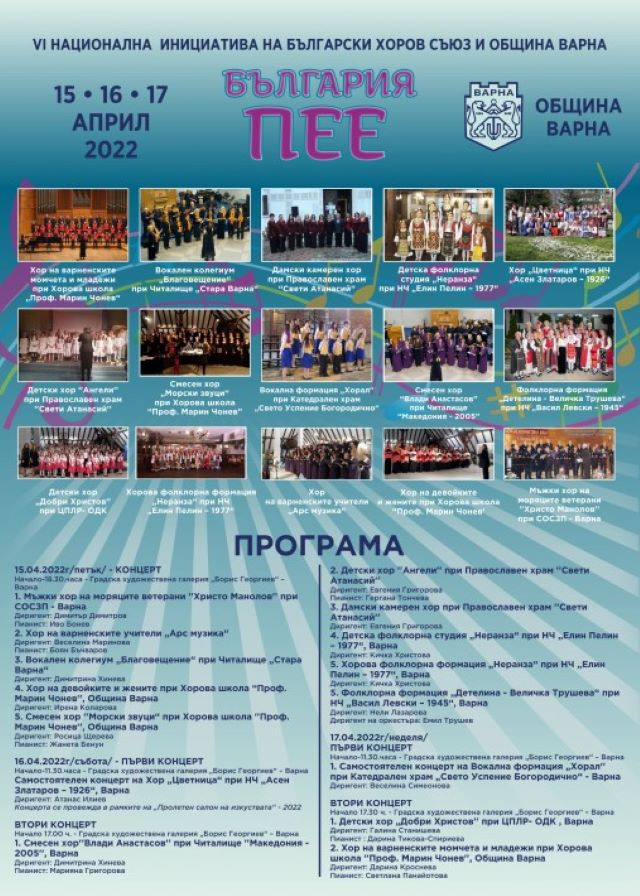 С общо пет концерта Варна се включва в VI национална инициатива „България пее“. От 15-ти до 17-ти април на територията на цялата страна ще бъдат представени красотата, богатството и колорита на хоровото майсторство у нас. Инициативата е на Българския хоров съюз и ще се проведе под мотото „Заедно“. Кампанията има за цел да продължи обединяването на хоровете от страната, да демонстрира потенциала и желанието за развитието на българското хорово изкуство у нас. В инициативата „България пее“ участват смесени, камерни, еднородни, детски, църковни, ученически, народни хорове.