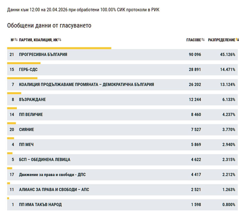 Коалиция "Прогресивна България" получава 90 096 гласа, което представлява 45,126% от гласовете в 3 МИР-Варна.